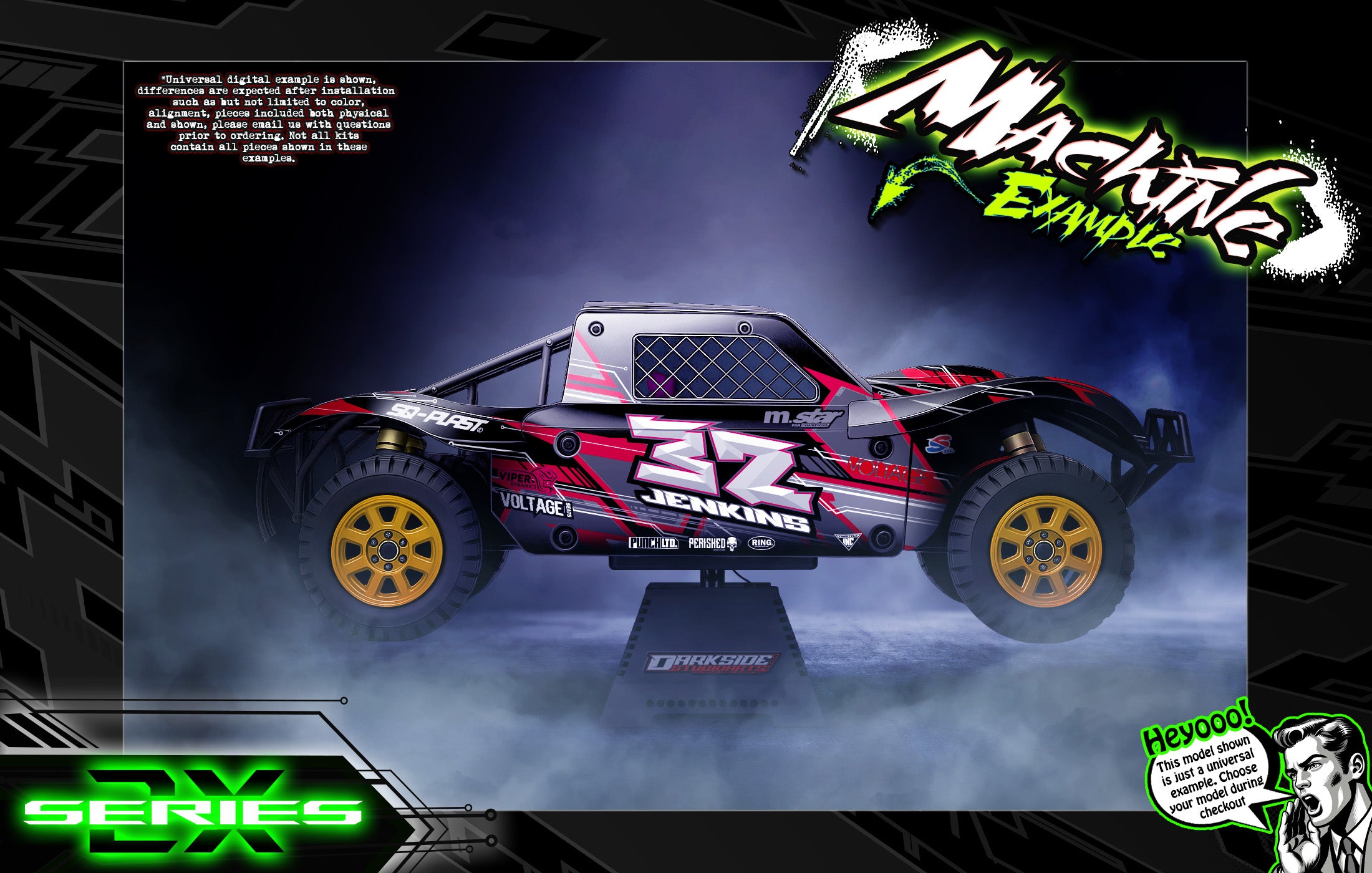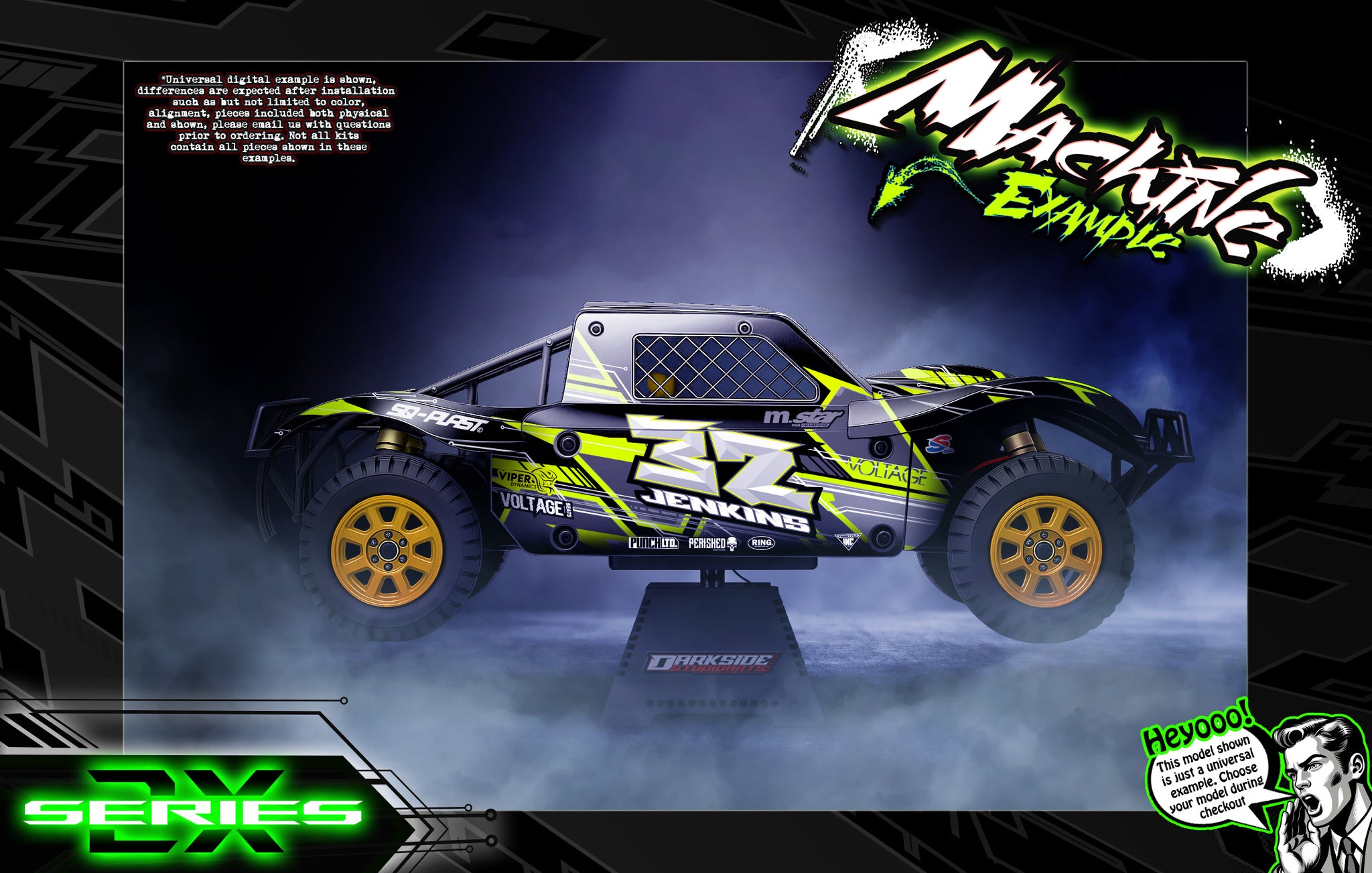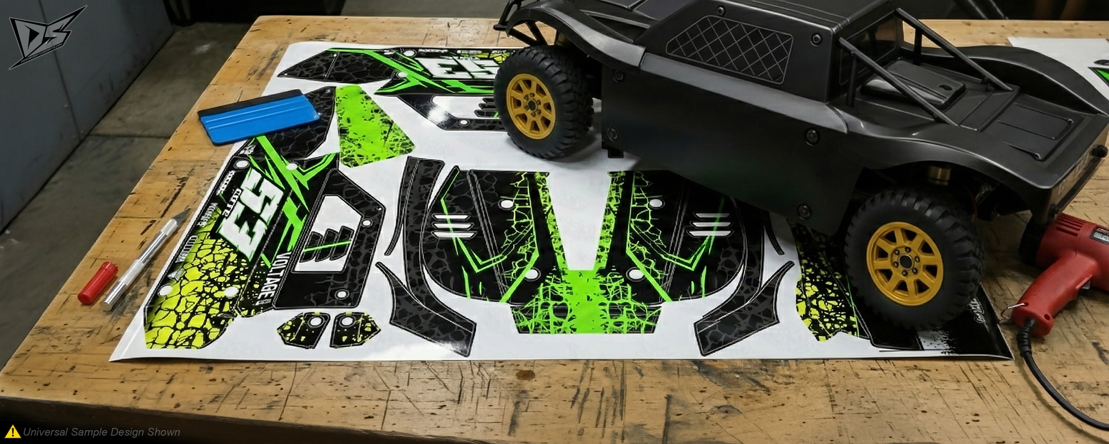 This aftermarket hop-up graphics skin product is specially engineered for use on RC vehicle bodies, which are precision cut for specific easy body fitment applications.