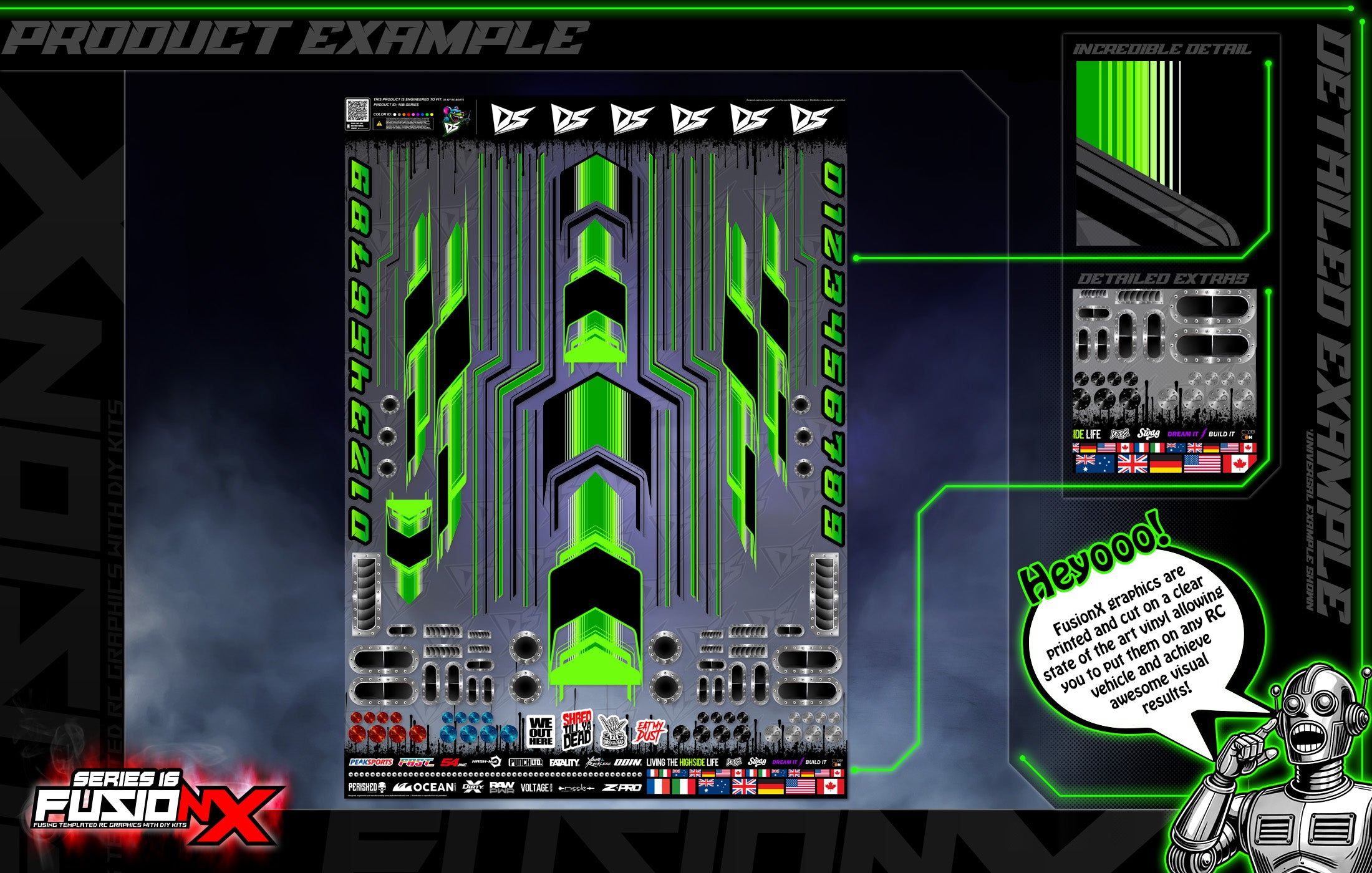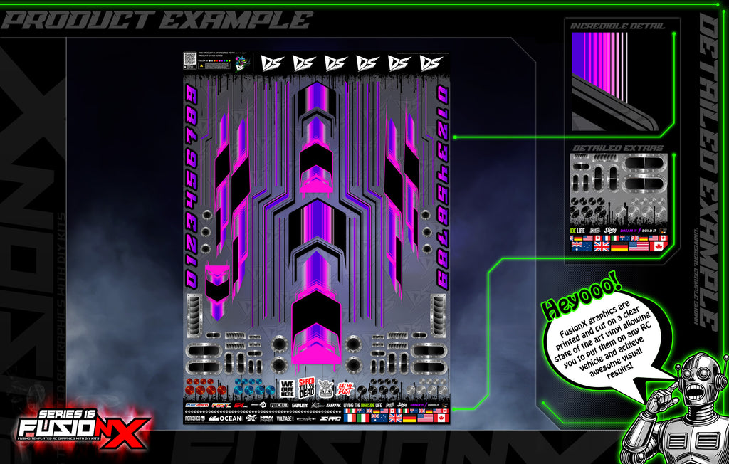 FusionX by Darkside Studios is the ultimate solution for RC enthusiasts seeking a seamless blend of precision and personalization graphics wraps and skins. This innovative line of graphics combines the perfection of templated, pre-cut designs with the flexibility of do-it-yourself trim-to-fit options. Beautifully printed on durable clear vinyl, FusionX allows hobbyists to create truly one-of-a-kind custom RC builds while maintaining professional-grade results. Whether you’re a seasoned pro or a creative beginner, FusionX empowers you to design with confidence and stand out.Designed for compatibility with popular brands and RC genres, FusionX graphics are suitable for and designed specifically around each RC segment including RC air, land, water, bash, drift, drag and more. Each kit is crafted to enhance the aesthetic appeal of your machine while offering infinite customization possibilities. From bold racing stripes to intricate patterns, FusionX lets you fuse your style with cutting-edge graphics for a unique, show-stopping look. With FusionX, the only limit is your imagination.