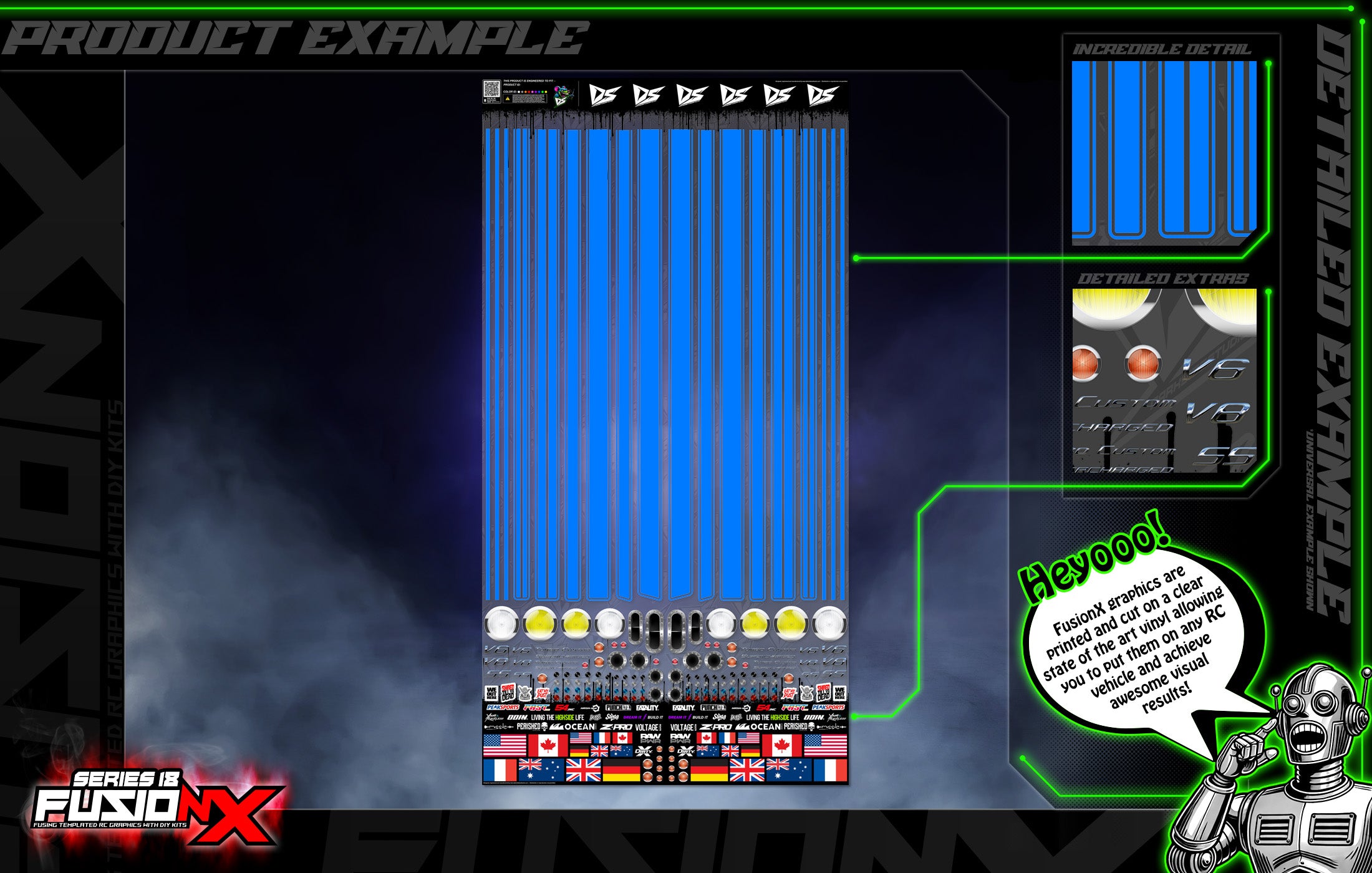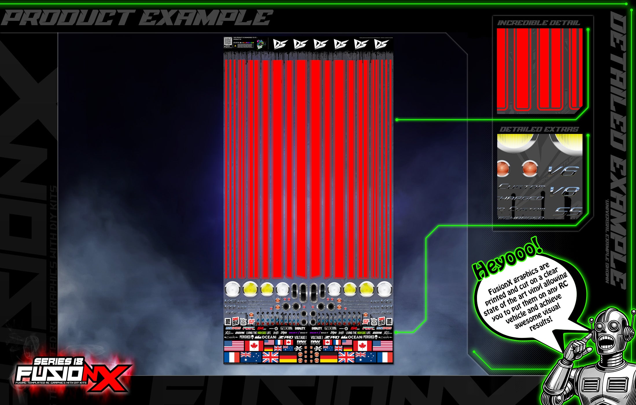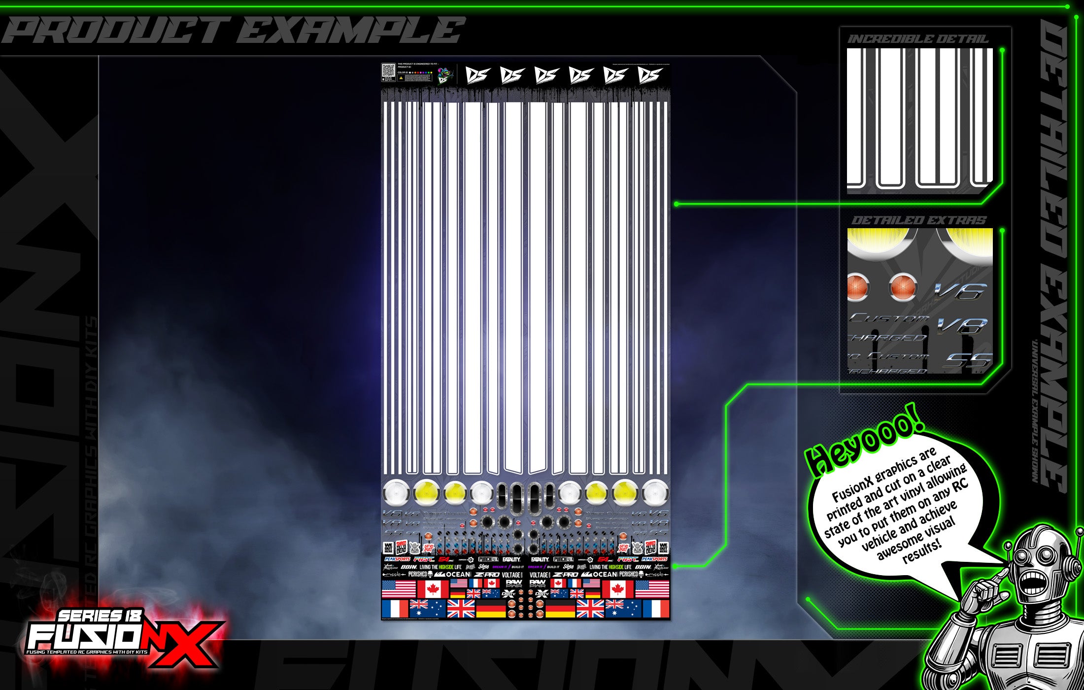FusionX by Darkside Studios is the ultimate solution for RC enthusiasts seeking a seamless blend of precision and personalization graphics wraps and skins. This innovative line of graphics combines the perfection of templated, pre-cut designs with the flexibility of do-it-yourself trim-to-fit options. Beautifully printed on durable clear vinyl, FusionX allows hobbyists to create truly one-of-a-kind custom RC builds while maintaining professional-grade results. Whether you’re a seasoned pro or a creative beginner, FusionX empowers you to design with confidence and stand out.Designed for compatibility with popular brands and RC genres, FusionX graphics are suitable for and designed specifically around each RC segment including RC air, land, water, bash, drift, drag and more. Each kit is crafted to enhance the aesthetic appeal of your machine while offering infinite customization possibilities. From bold racing stripes to intricate patterns, FusionX lets you fuse your style with cutting-edge graphics for a unique, show-stopping look. With FusionX, the only limit is your imagination.