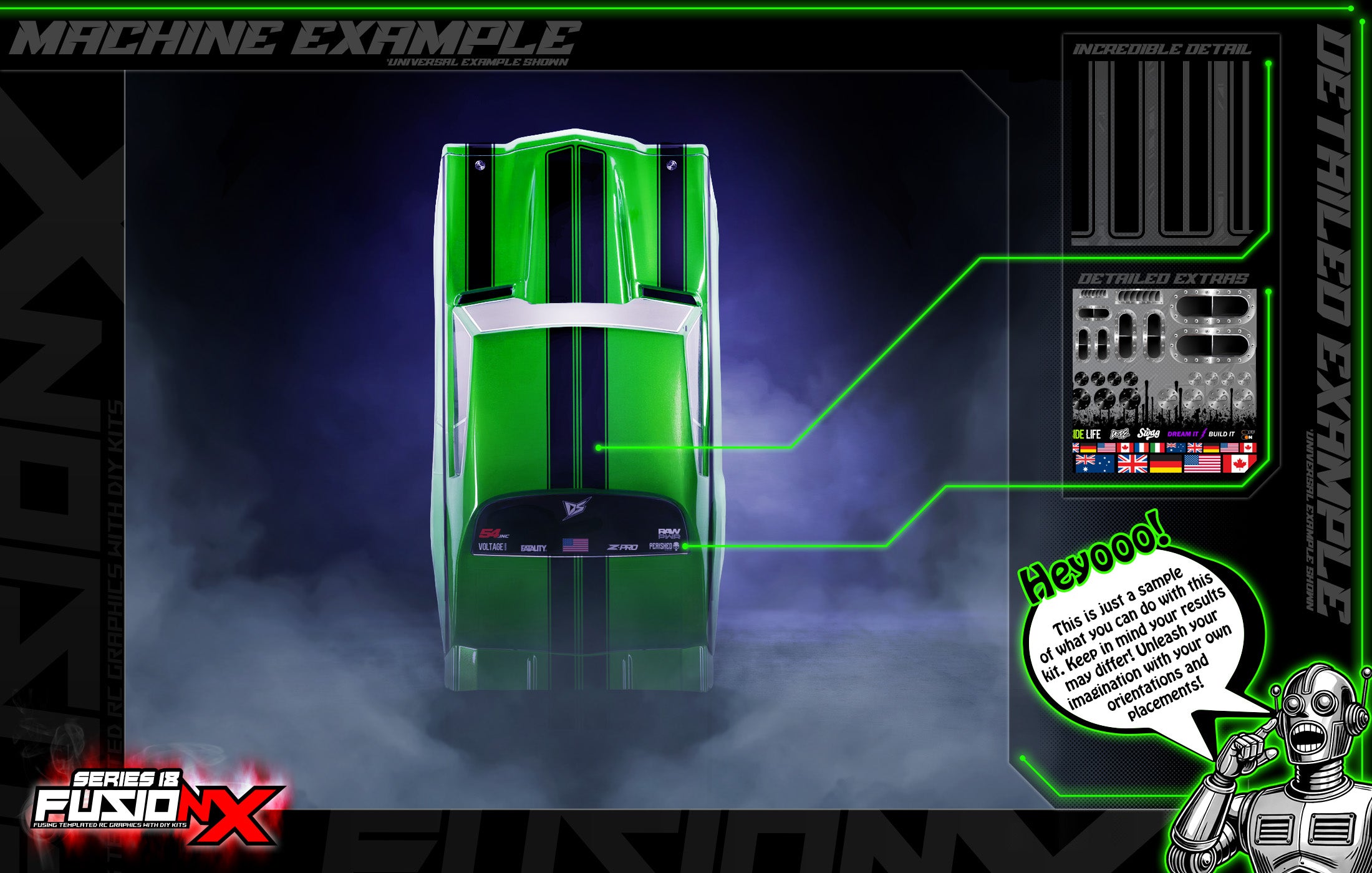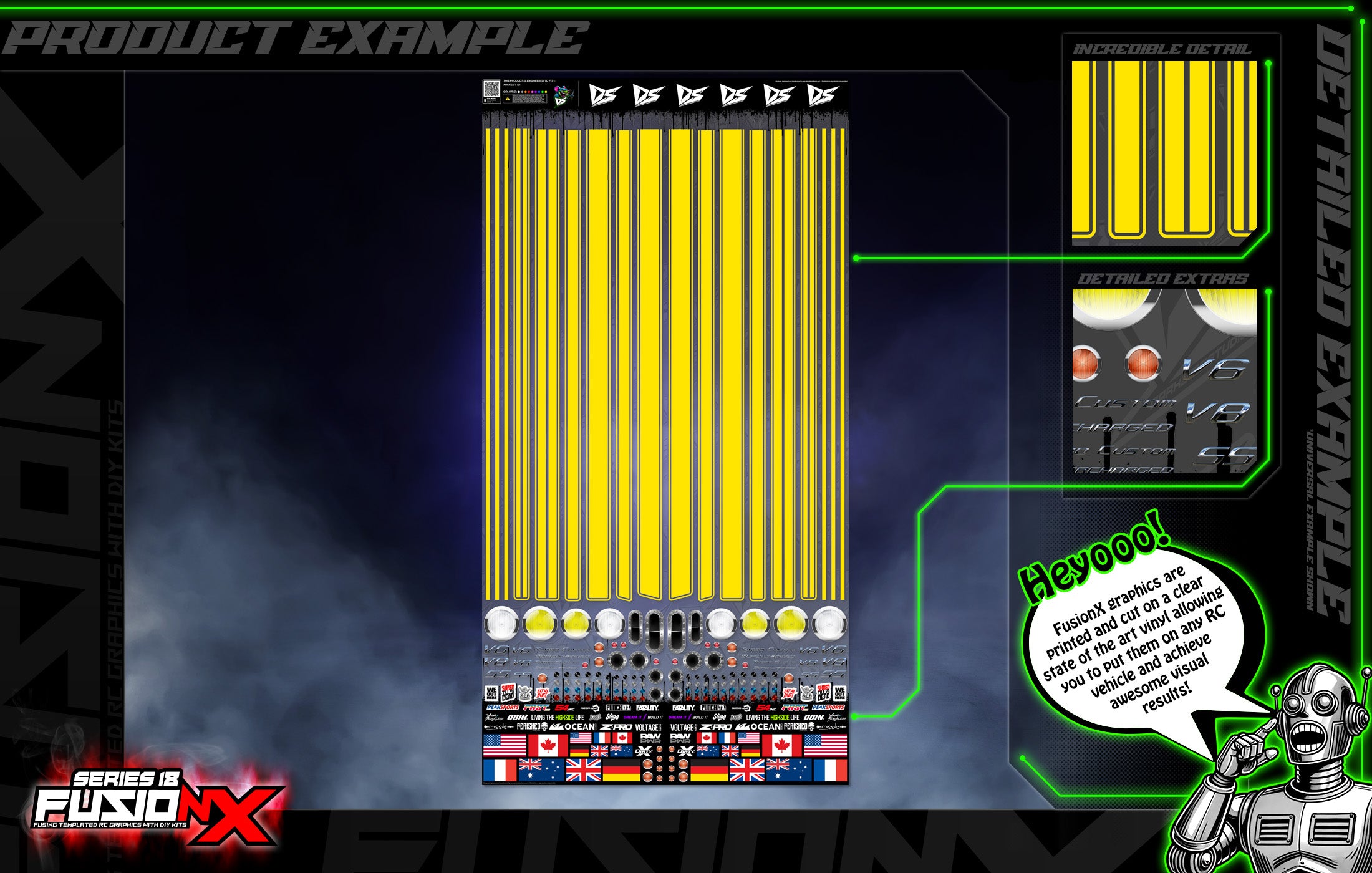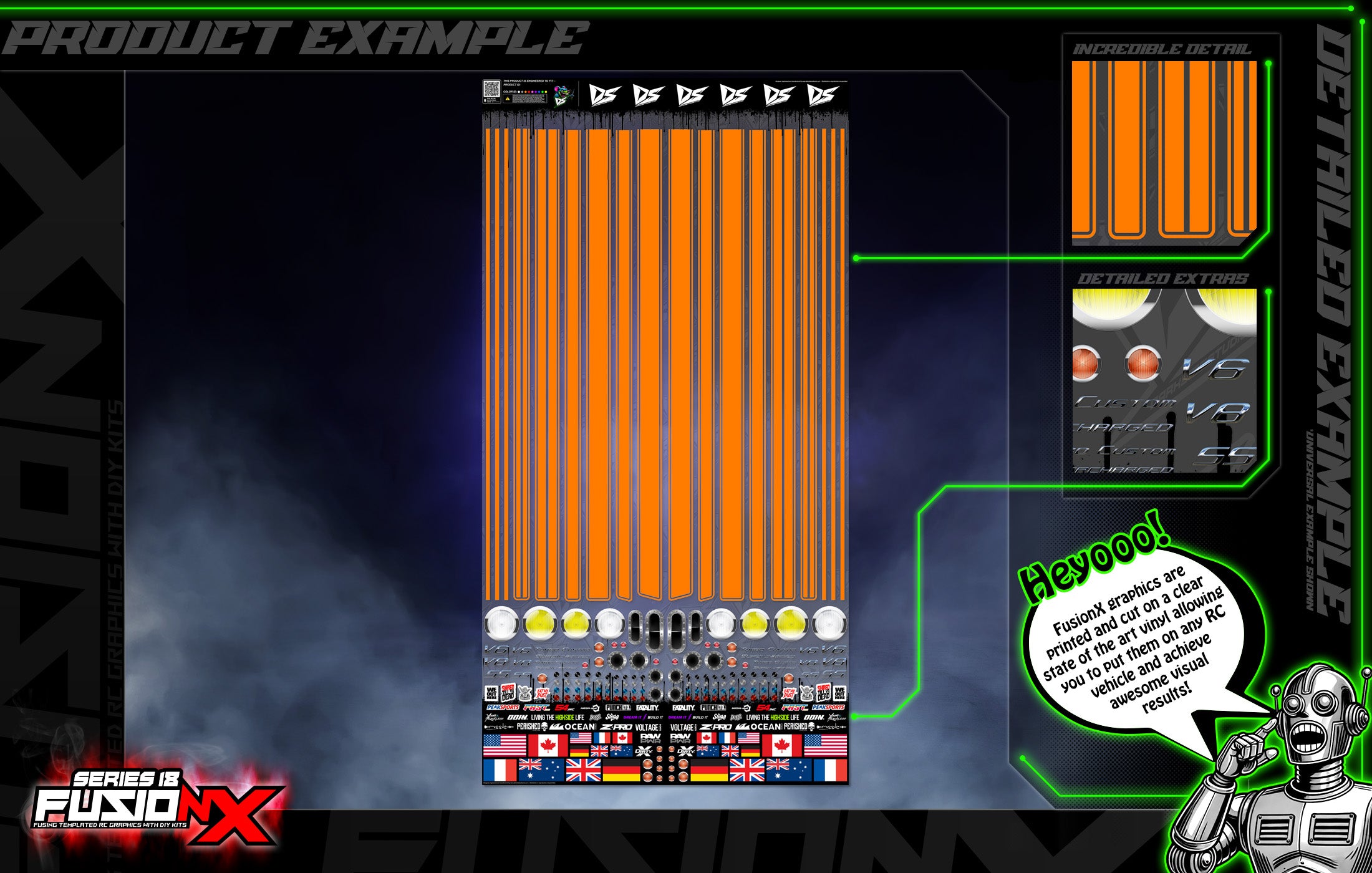 FusionX by Darkside Studios is the ultimate solution for RC enthusiasts seeking a seamless blend of precision and personalization graphics wraps and skins. This innovative line of graphics combines the perfection of templated, pre-cut designs with the flexibility of do-it-yourself trim-to-fit options. Beautifully printed on durable clear vinyl, FusionX allows hobbyists to create truly one-of-a-kind custom RC builds while maintaining professional-grade results. Whether you’re a seasoned pro or a creative beginner, FusionX empowers you to design with confidence and stand out.Designed for compatibility with popular brands and RC genres, FusionX graphics are suitable for and designed specifically around each RC segment including RC air, land, water, bash, drift, drag and more. Each kit is crafted to enhance the aesthetic appeal of your machine while offering infinite customization possibilities. From bold racing stripes to intricate patterns, FusionX lets you fuse your style with cutting-edge graphics for a unique, show-stopping look. With FusionX, the only limit is your imagination.