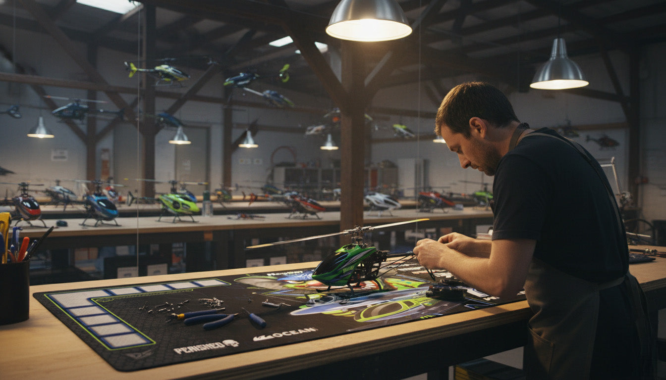 'RC Helicopter Series' Premium RC Pit / Work Mat – Customizable, Rollable, Rubber non-slip base, Polyester Top, Stitched Edges