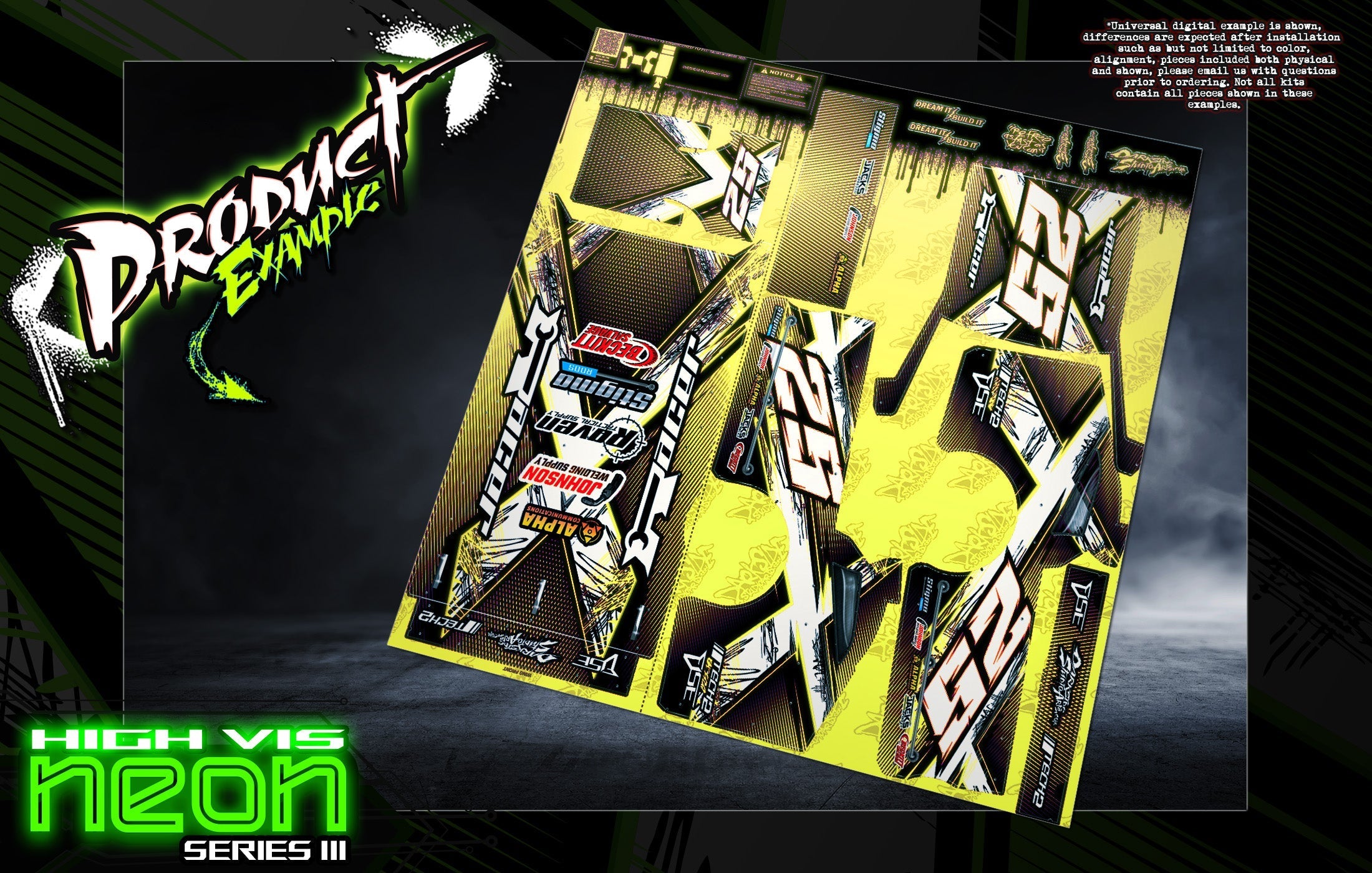 Our neon kits are printed using a base triple pass of white ink, allowing a true neon high vis vinyl to show through in certain areas. After our white pass of inks are done, the machines come back and lay logo colors and other aspects down. These kits are very time consuming and hard to print, and are designed for the racer who requires the highest visibility on and off the competition circuit, or the serious weekend warrior.