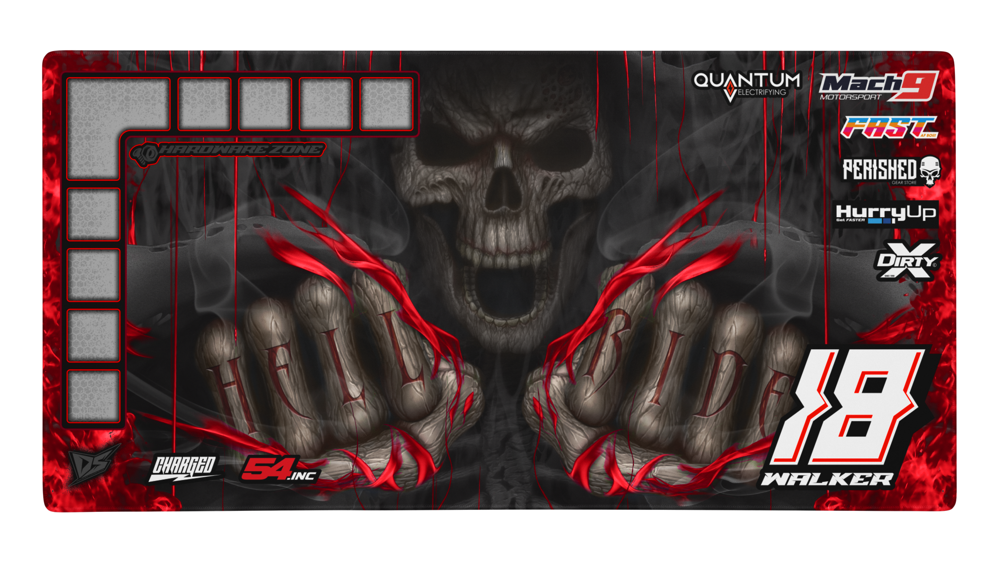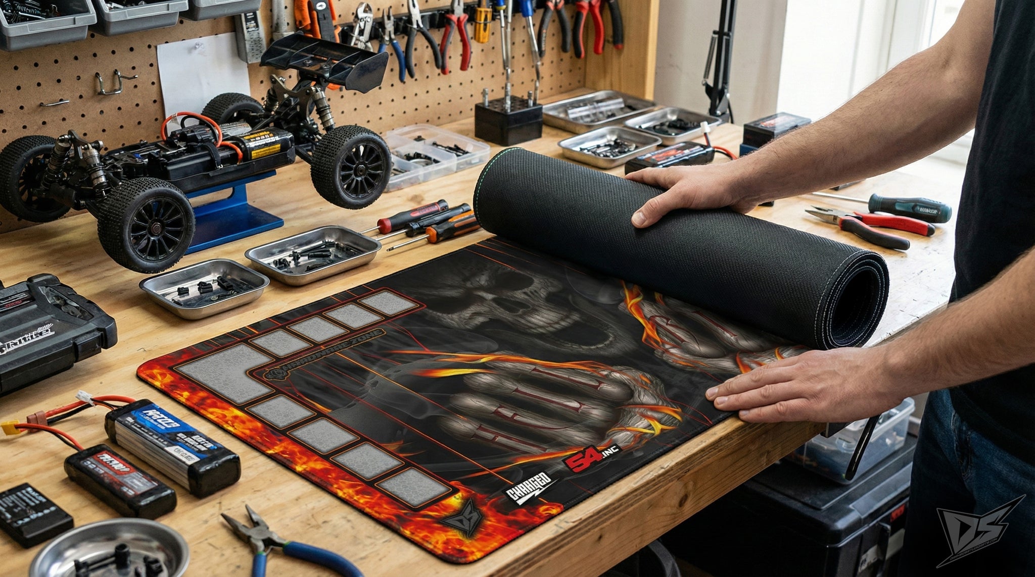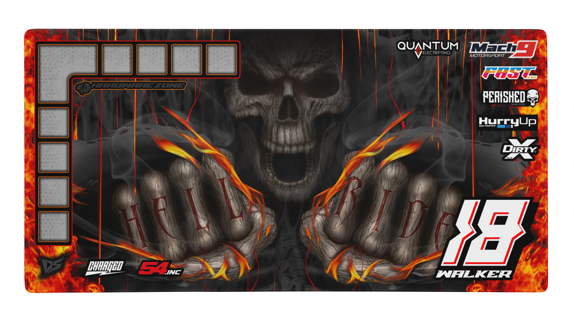 'Hell Ride' Premium RC Pit / Work Mat – Customizable, Rollable, Rubber non-slip base, Polyester Top, Stitched Edges