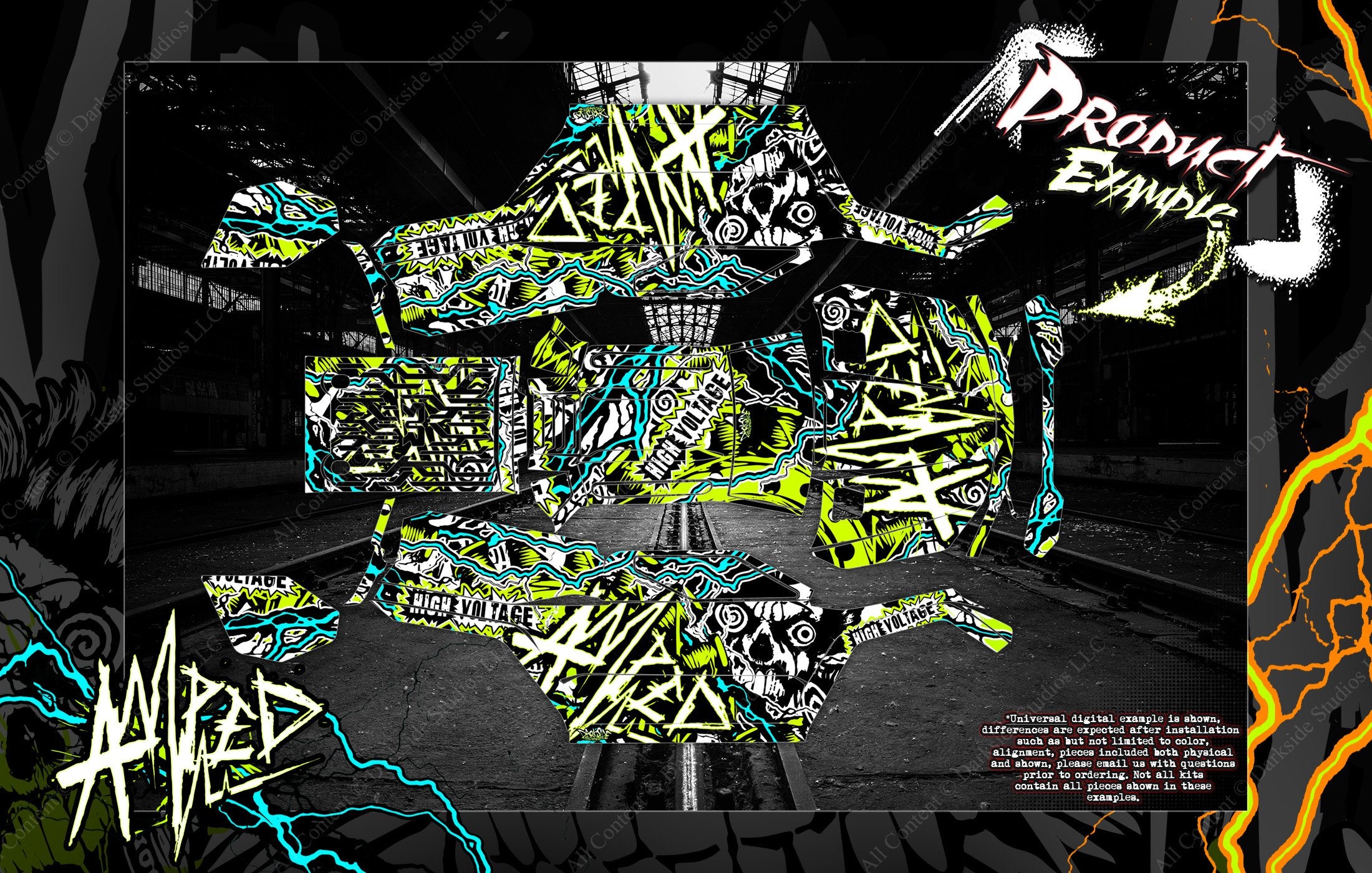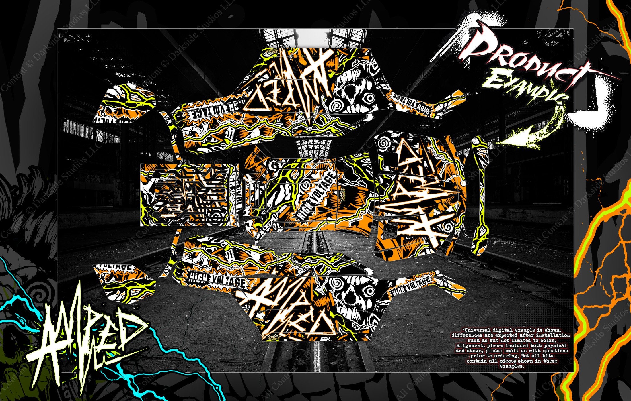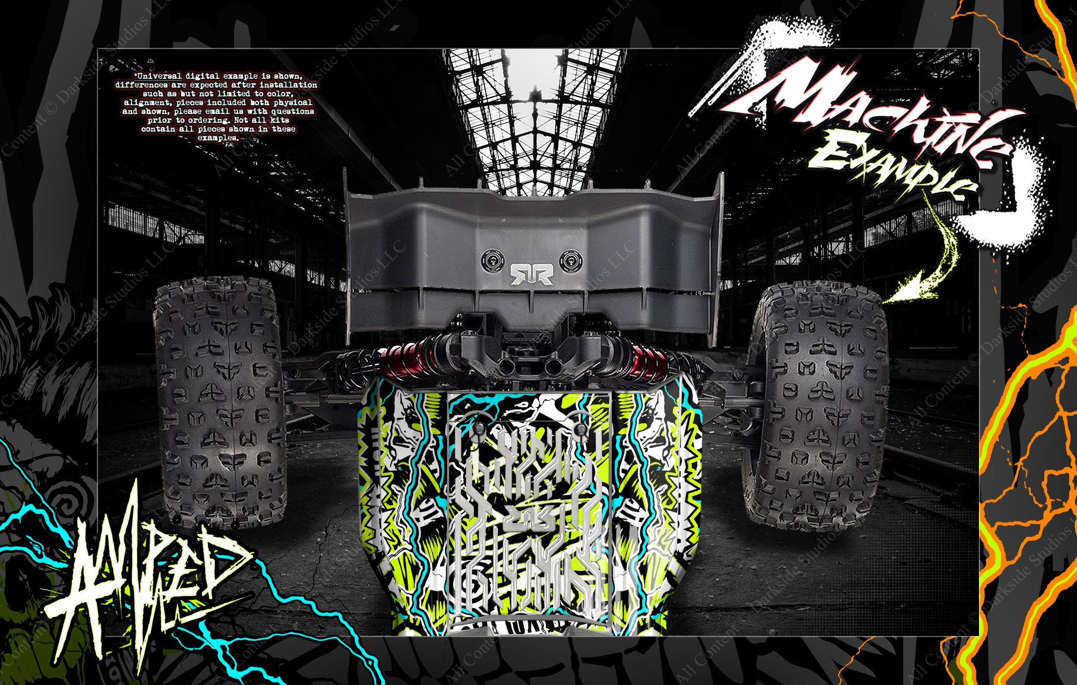 Universal examples are shown, there are differences between kits. Kraton 6s does not have cutouts in the bed. Graphic on that model can be pressed into the bed imprints.