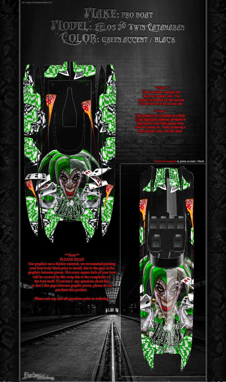 This aftermarket hop-up graphics skin product is specially engineered for use on RC boat hulls, which are precision cut for specific easy hull and cap fitment applications.